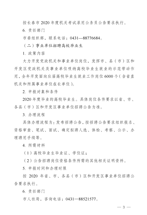大力开发党政机关和事业单位岗位,发挥市、县(市)区和开发区党政机关及事业单位吸纳高校毕业生就业的示范带动作用,全年开发面向应届高校毕业生就业工作岗位6000个(含省直机关和所属事业单位在长单位)。