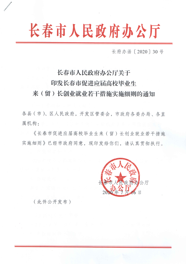 《长春市促进应届高校毕业生来(留)长创业就业若干措施实施细则》已经市政府同意,现印发给你们,请认真贯彻执行。