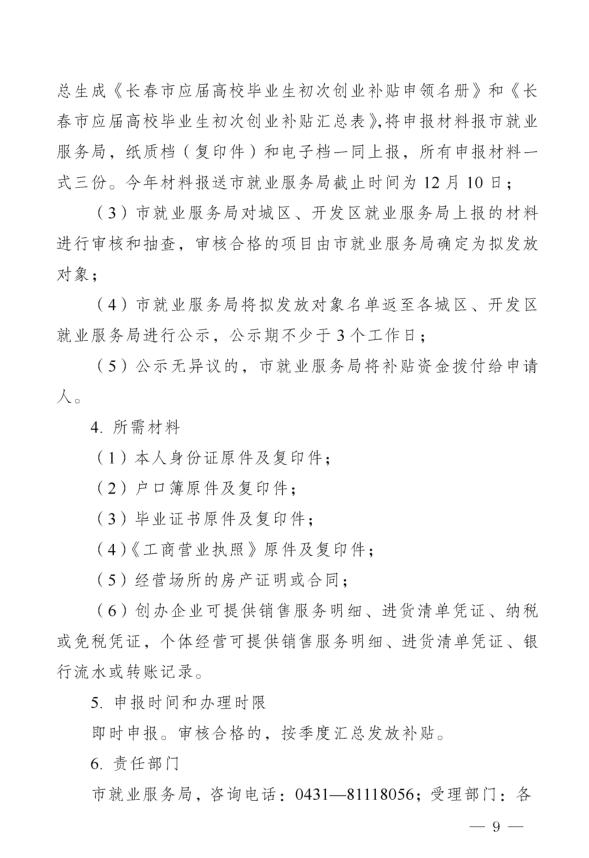 (2)各城区、开发区就业服务局受理后,通过实地走访调查方式对申请人相关信息及提交材料进行核查,确保项目的真实性。各城区、开发区就业服务局初审合格后填写《长春市应届高校毕业生初次创业补贴审批表》签署意见并加盖公章,按季度汇总生成《长春市应届高校毕业生初次创业补贴申领名册》和《长春市应届高校毕业生初次创业补贴汇总表》,将申报材料报市就业服务局,纸质档(复印件)和电子档一同上报,所有申报材料一式三份。今年材料报送市就业服务局截止时间为12月10日;