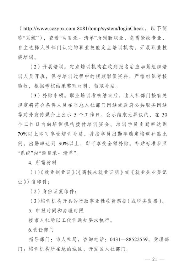 指导部门:市人社局,咨询电话:0431—88522559,受理部门:培训机构所在地的城区、开发区人社部门。
