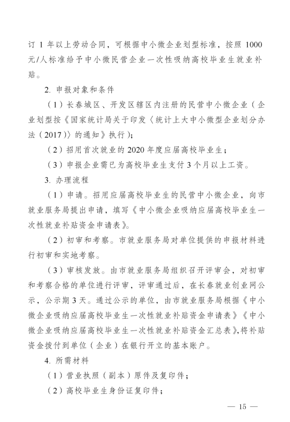 (1)申报企业条件:吸纳2020年度毕业的高校毕业生就业的中小微企业(企业划型按《国家统计局关于印发〈统计上大中小微型企业划分办法(2017)〉的通知》执行);