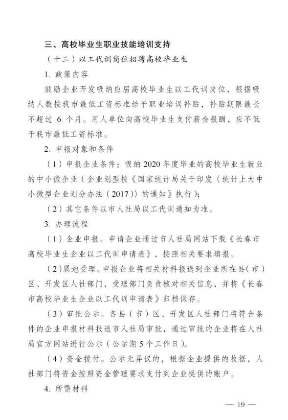 (2)属地受理。申报企业将相关材料报送到企业所在县(市)区、开发区人社部门,受理部门负责核对相关信息,并将《长春市高校毕业生企业以工代训申请表》归档保存。