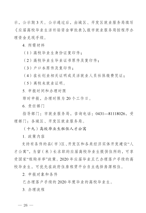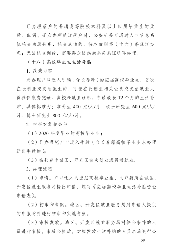 对办理户口迁入手续(含长春籍)的应届高校毕业生,首次在长创业或灵活就业的,可凭在长创业相关证明或灵活就业人员社保缴费凭证、离校未就业证明,申请最长12个月的生活补贴,具体标准为:本科生400元/人/月、硕士研究生600元/人/月、博士研究生800元/人/月。
