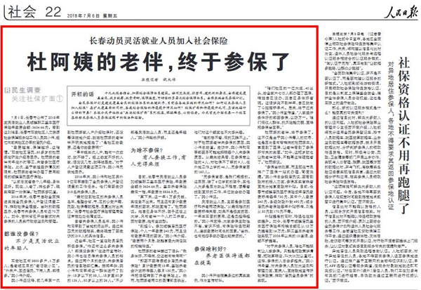 7月6日出版的《人民日报》“民生调查—关注社保扩面”专栏以《杜阿姨的老伴,终于参保了》为题,深入报道了我市医疗保险启动参保扩面工作以来取得的主要成效,通过市民群众与医保工作者、社区工作人员一个个感人故事,反映了参保扩面工作给普通百姓生活带来的变化。这也是该专栏刊发的首期深度报道。