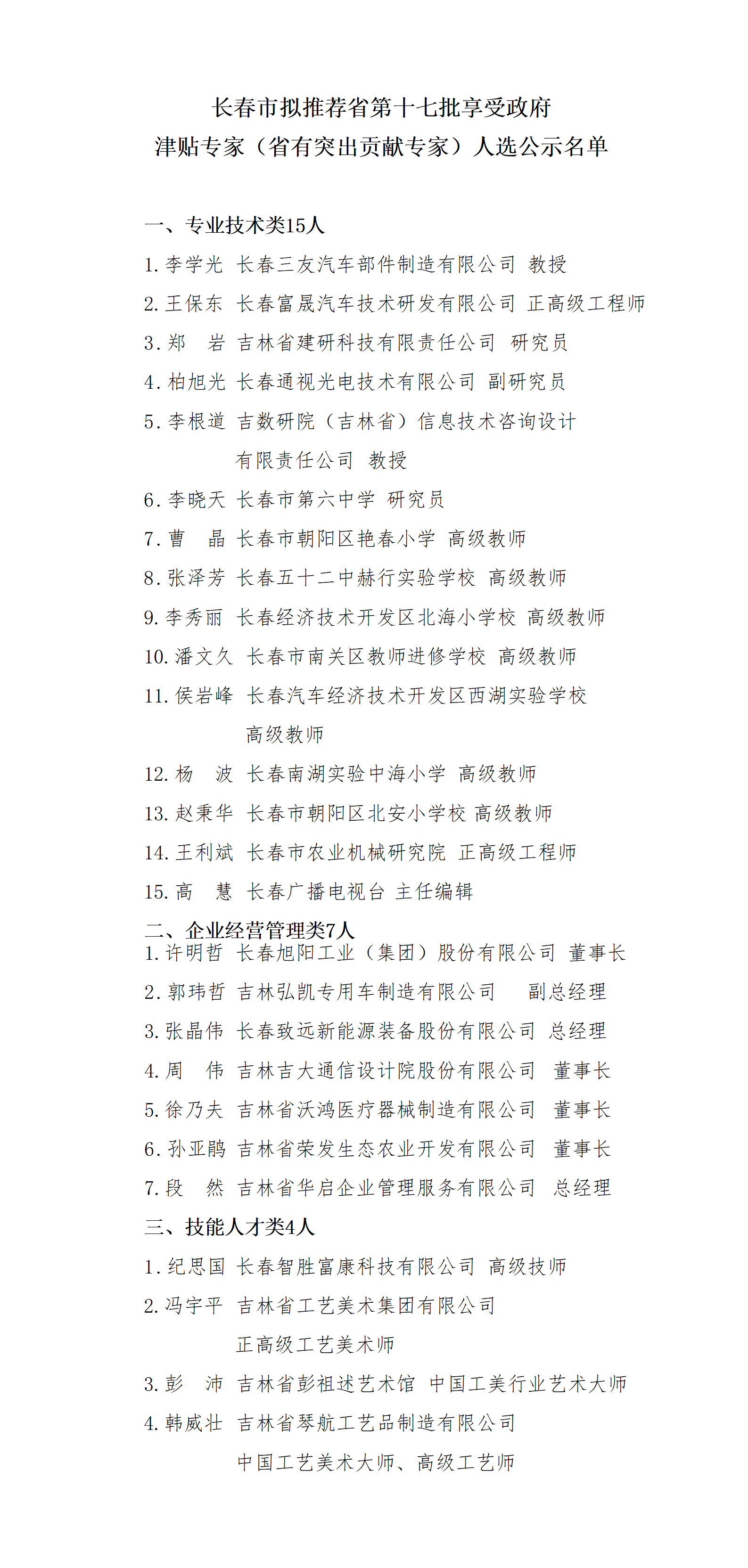 根据吉林省人社厅印发的《关于开展吉林省第十七批享受政府津贴专家(省有突出贡献专家)选拔工作的通知》(吉人社函[2022]113号)文件要求,9月25日,我局抽调相关领域(行业)专家对申报人选进行了评审,确定了拟推荐人选(专业技术类15人、企业经营管理类7人、技能类4人),现予以公示。