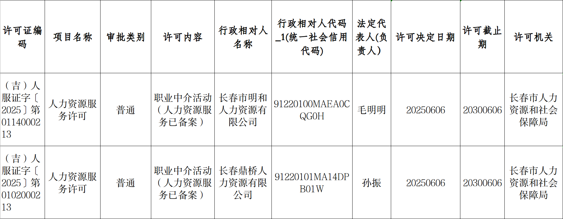 长春市人社局人力资源服务许可行政许可公示(2025年6月6日)