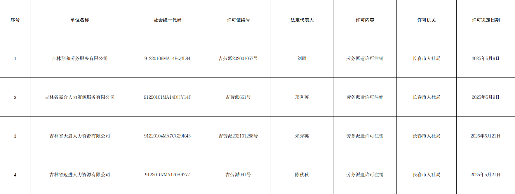 长春市劳务派遣经营许可单位注销信息公示(2025年4月21日至5月31日)