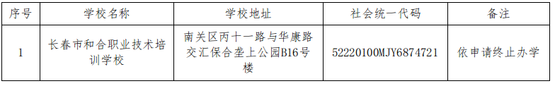 根据《中华人民共和国民办教育促进法》、《关于印发〈吉林省民办职业培训学校管理办法(试行)〉的通知》(吉人社办字〔2011〕83号)。长春市和合职业技术培训学校主动申请注销民办职业培训学校办学许可证。申请单位已成立了注销清算小组,办理了债权债务公告,完成了财产审计清算工作。长时间无招生,无需处理学员善后工作。经审查,申请单位的清算结果符合相关规定,申请注销材料齐备。现收回办学许可证向社会公示,抄送登记机关办理注销事宜。