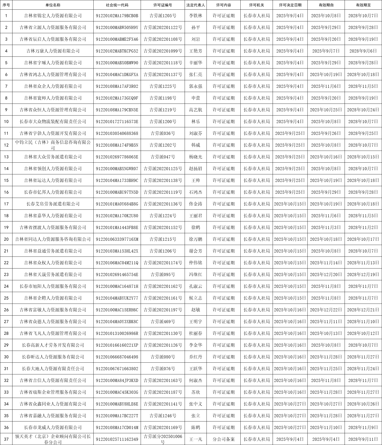 长春市劳务派遣经营许可单位延期、分公司备案信息公示(2025年9月1日至10月31日)