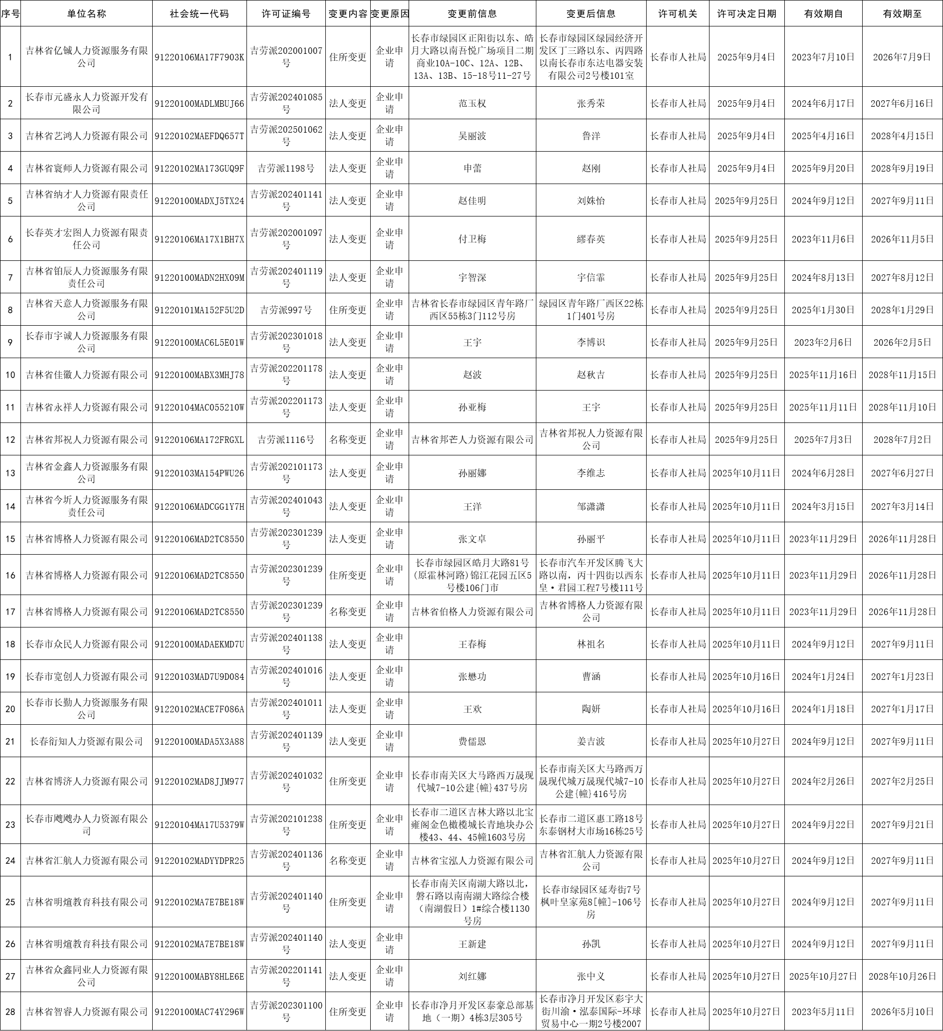 长春市劳务派遣经营许可单位信息变更信息公示(2025年9月1日至10月31日)