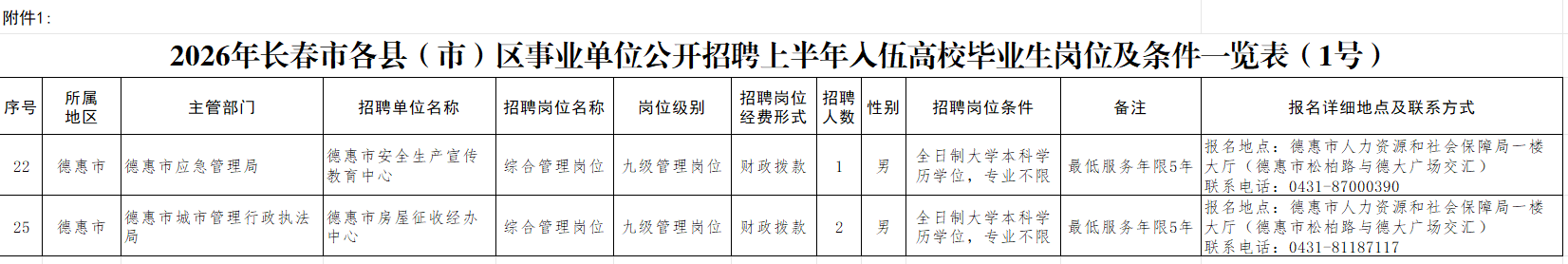 根据德惠市招聘单位及主管部门工作需要,现对《2026年长春市各县(市)区事业单位公开招聘上半年入伍高校毕业生公告(1号)》(2026年1月15日发布)附件1有关内容变更如下:
