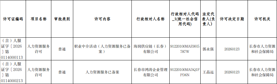长春市人社局人力资源服务许可行政许可公示(2026年1月23日)