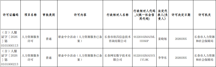 长春市人社局人力资源服务许可行政许可公示(2026年3月5日)